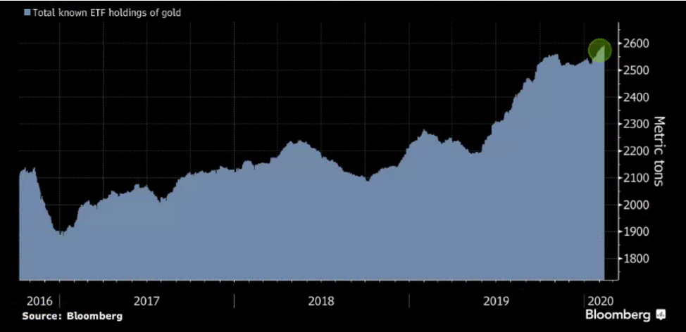 ข้อมูลล่าสุดที่ผมค้นจาก Bloomberg พบว่า ตัวเลขการถือครองทองคำผ่านการลงทุน ETFs ปรับขึ้นสูงสุดเป็นประวัติการณ์อีกครั้งที่ปริมาณการถือครองทองคำสูงถึง 2,500 ตัน และยังคงเพิ่มขึ้นต่อเนื่องในปีนี้ เช่นเดียวกับราคาทองคำที่ค่อย ๆ ปรับขึ้นมาจนใกล้เคียง 1,600 ดอลลาร์ต่อออนซ์อีกครั้ง