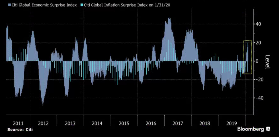 เมื่อกลับมาที่ภาคเศรษฐกิจจริง ดูเหมือนความพยายามฉีดเงินอย่างต่อเนื่องของเหล่าธนาคารกลางนั้นเริ่มส่งผลบวกต่อเศรษฐกิจโดยรวมอีกครั้ง โดย Citi Global Economic Surprise Index เริ่มพลิกกลับมาเป็นบวก หมายถึงตัวเลขเศรษฐกิจโดยรวมเริ่มประกาศออกมาดีกว่าที่ตลาดคาดการณ์