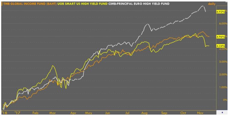 ล่าสุดตราสารหนี้ประเภท High Yield Bond Fund ที่ราคาปรับเพิ่มขึ้นต่อเนื่องในรอบหลายปีที่ผ่านมาเริ่มเห็นการปรับฐานเล็ก ๆ ประมาณ 1% เช่นเดียวกับกองทุน Global Bond ซึ่งรอบ 1 – 2 ปีที่ผ่านมาได้รับความสนใจจากนักลงทุนไทยเป็นจำนวนมาก