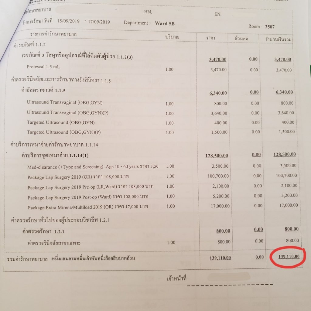 ปรากฎว่าผล MRI ออกมาบอกว่าทุกอย่างปกติดี กระดูกสันหลังปกติ หมอนรองกระดูกปกติ แต่ความผิดปกติที่พบคือเจอก้อนซีสต์บริเวณปีกมดลูกด้านซ้าย พอได้ไปพบแพทย์สูตินารีเวชต่อ อัลตราซาวด์อะไรเรียบร้อย คุณหมอแนะนำว่าให้ผ่าออก โดยจะใช้วิธีการผ่าตัดโดยการส่องกล้อง ซึ่งค่าใช้จ่ายรวมนอนโรงพยาบาล BNH 2 คืน อยู่ที่ประมาณ 140,000 บาท