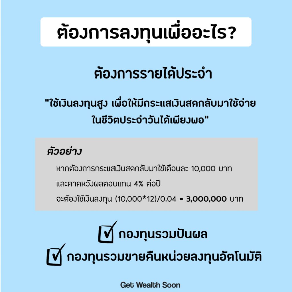 ดังนั้นกองทุนรวมที่เหมาะสม คือ กองทุนรวมประเภทที่ปันผล และกองทุนรวมประเภทขายคืนหน่วยลงทุนอัตโนมัติ (Auto Redemption)