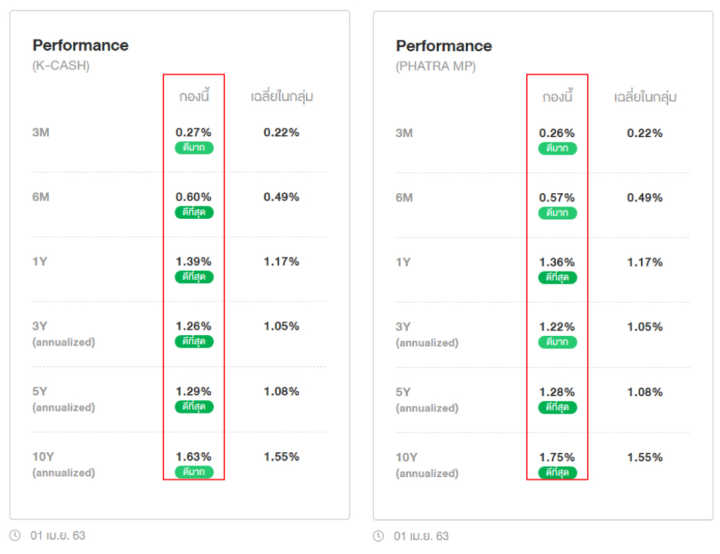 ผลตอบแทนย้อนหลัง 1 ปี ของกองทุน K-CASH อยู่ที่ 1.39% และกองทุน PHATRA MP อยู่ที่ 1.36% ซึ่งอยู่ในเกณฑ์ “ดีที่สุด” หมายความว่า ในการจัดอันดับกองทุนประเภทเดียวกัน 100 อันดับ