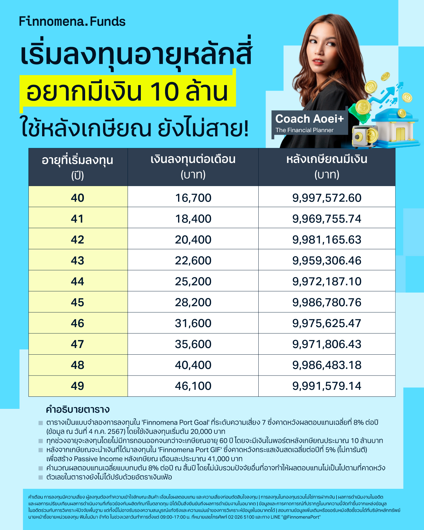 - ทุก ๆ ช่วงอายุในตาราง จะใช้เงินลงทุนก้อนแรกจำนวน 20,000 บาท ตามจำนวนเงินลงทุนขั้นต่ำครั้งแรกของ Finnomena Port Goal โดยลงทุนที่ระดับความเสี่ยง 7 คาดหวังผลตอบแทนเฉลี่ยทบต้นปีละ 8% (ข้อมูล ณ วันที่ 4 ก.ค. 2567)
