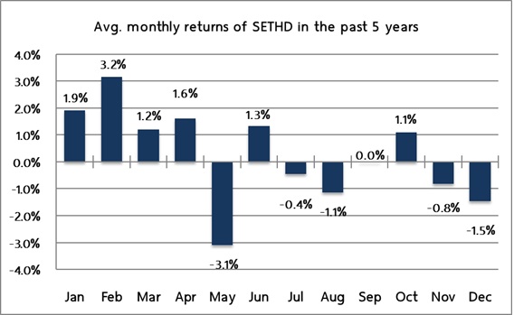 หากเรานำสถิติในอดีตมาพิจารณา ในช่วงเดือน ก.พ. ของทุกปี มักจะเป็นช่วงเวลาที่ดีของหุ้นปันผล โดยสังเกตได้จากดัชนี SETHD (SET High Dividend 30 Index) ปรับตัวขึ้นเฉลี่ย 3.2%ในเดือนก.พ. ในช่วง 5 ปีที่ผ่านมา เนื่องจากเป็นช่วงที่บริษัทจดทะเบียนส่วนใหญ่จะประกาศจ่ายเงินปันผลในช่วง 1-3 เดือนข้างหน้า ทำให้นักลงทุนมักแห่เข้าลงทุนในหุ้นปันผล ทำให้ช่วงดังกล่าวเป็นช่วงที่ให้ผลตอบแทนได้ดีที่สุดสำหรับหุ้นกลุ่มนี้ ทั้งนี้กลุ่มหุ้นปันผลดังกล่าวยังสร้างผลตอบแทนเฉลี่ยเป็นบวกในช่วง 4 เดือนแรกของปีด้วยเช่นกัน