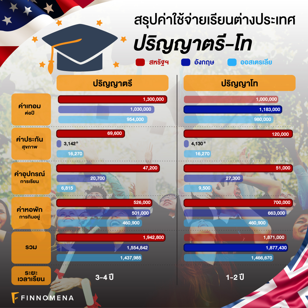 แน่นอนว่างานช้างคือระดับปริญญา โดยเฉพาะถ้าพ่อแม่คิดส่งลูกไปเรียนต่างประเทศ ดังนั้นสิ่งที่เราจะเจาะลึกกันในบทความนี้ หลักๆ ก็จะเป็นจำนวนเงินและการวางแผนค่าใช้จ่ายที่จะต้องใช้ในการส่งลูกเรียนต่อต่างประเทศ ในประเทศผู้นำด้านการศึกษาอย่างสหรัฐอเมริกา อังกฤษ และออสเตรเลีย รายละเอียดทั้งหมดสามารถนำมาวางแผนจัดพอร์ตเพื่อออมเงินในระยะยาว ช่วยให้พ่อแม่วางเป้าหมายแนวทางการศึกษาของลูกๆ ได้ชัดเจน และประมาณการค่าใช้จ่ายได้เพียงพอ