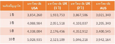 ตารางข้างบนแสดงค่าใช้จ่ายแบบแยกย่อยแต่ละประเภท ซึ่งจริงๆ อาจจะมากหรือน้อยกว่านี้ก็ได้ตามแต่ละกรณีไปแต่ค่าใช้จ่ายที่หยิบมาคุยกันในวันนี้จะเป็นค่าใช้จ่ายของมหาวิทยาลัยที่มีชื่อเสียงในระดับTop 10 ของอเมริกา อังกฤษ และออสเตรเลีย อย่างละ 1 มหาวิทยาลัย
