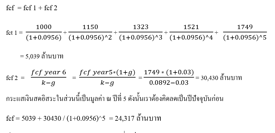 จากกระแสเงินสดอิสระที่ประเมินมาจากบทความ เราจะประมาณการเติบโต (Growth) อย่างไร เราคิดลดมูลค่ากระแสเงินสดเป็นมูลค่าปัจจุบันได้ที่ 24,317 ล้านบาท ซึ่งเราคำนวณมาจากการประมาณกระแสเงินสดตลอดอายุของกิจการแล้วคิดลดกลับมา โดยเราจะแบ่งกระแสเงินสดอิสระออกเป็น 2 ช่วง คือ ช่วงการเติบโตปกติกับช่วงที่เติบโตลดลง ซึ่งเรียกว่ามูลค่าในช่วงสุดท้าย (Terminal Value) โดยมีการเติบโตของกระแสเงินสดต่างกันคือ ช่วงแรก เติบโต 15% และช่วงที่ 2 เติบโต 3% ไปตลอดช่วงอายุของกิจการ