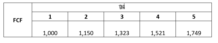 รูปที่ 1 ประมาณการกระแสเงินสดอิสระในช่วงที่ 1 (5 ปีแรก) ด้วยอัตราการเติบโต 15% ต่อปีทบต้น