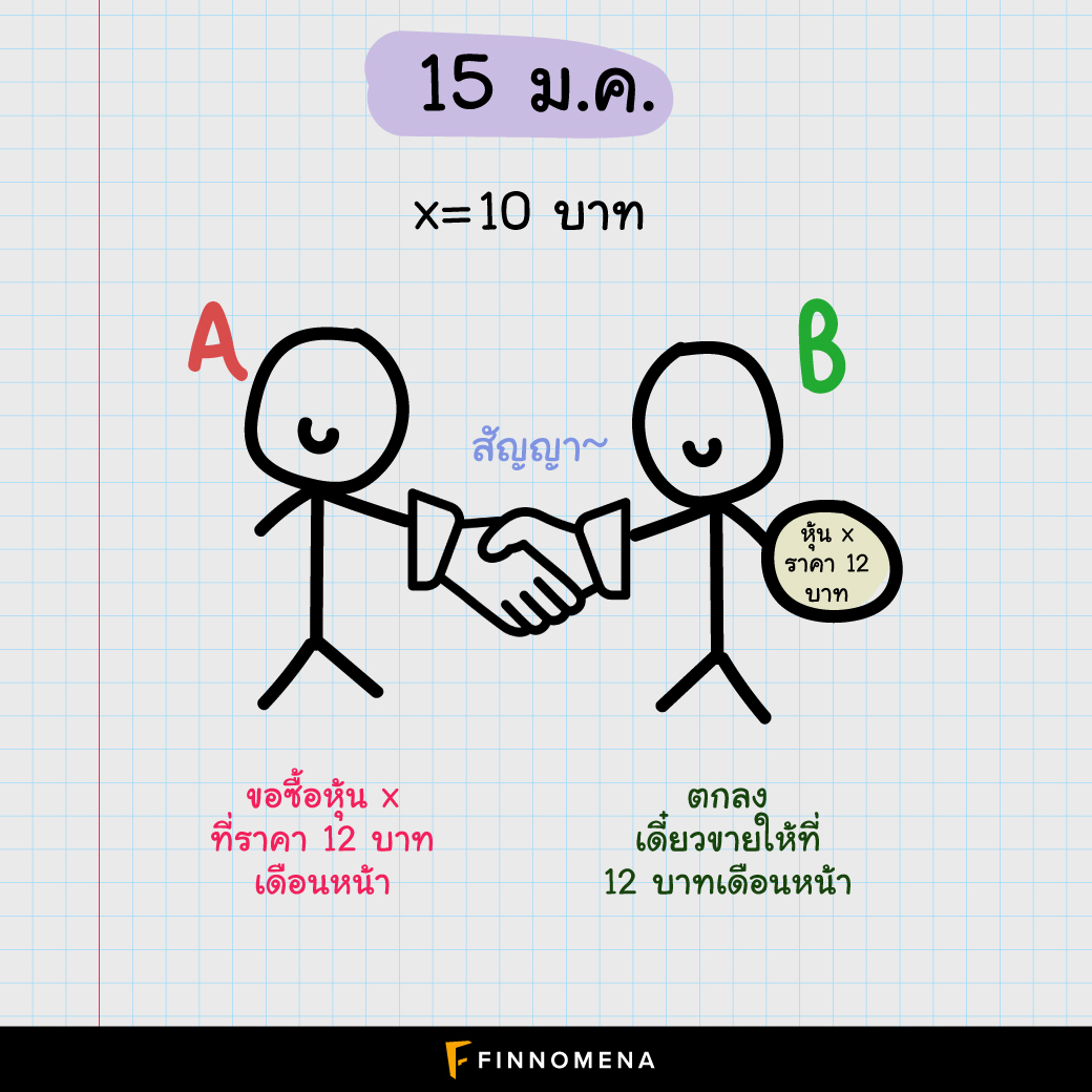 ตัวอย่างเช่น A ทำสัญญา Forward จะซื้อ หุ้น X ที่ราคา 12 บาทในอีก 1 เดือนข้างหน้า โดย B สัญญาจะขายหุ้น X ที่ราคา 12 บาทเช่นกัน