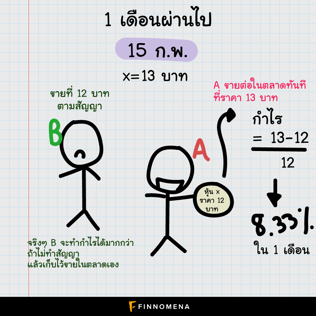 A ได้ซื้อหุ้น X จาก B ที่ราคา 12 บาทตามสัญญา Forward แล้วขายทันทีที่ราคา 13 บาท ทำให้ A ได้กำไรทันที 8.33% ((13-12)/12) ใน 1 เดือนทีเดียว ในขณะที่ B ต้องขายหุ้น X ให้ A ในราคา 12 บาท