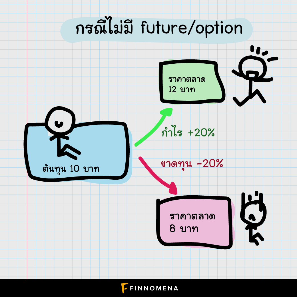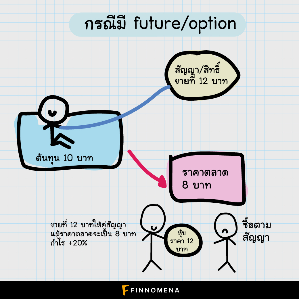 ดังนั้น ถ้าเราอยากจะลดความเสี่ยงในการลงทุนครั้งนี้ เราอาจจะซื้อหุ้น X พร้อมกับทำสัญญา Futures ขายหุ้น X ที่ราคา 12 บาทไว้ หรือเรียกอีกแบบคือซื้อ Put Option (สิทธิ์ในการขาย) หุ้น X ไว้ที่ราคา 12 บาท