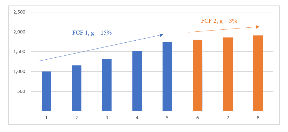 เราจะประมาณกระแสเงินสดอิสระไปตลอดช่วงอายุของกิจการ โดยเราอาจจะแบ่งช่วงการประมาณกระแสเงินสดอิสระออกเป็น 2 ช่วง คือ ช่วงแรก ประมาณจากสมมติฐานของเราหรือข้อมูลที่เรามี เช่น 5 ปีแรกเติบโต 15% ต่อปี และช่วงที่ 2 เป็นช่วงที่การเติบโตลดลงและจะเติบโตเท่านั้นไปตลอดช่วงอายุที่เหลือของกิจการ โดยเราอาจจะประมาณการเติบโตปีละ 3% เท่ากับอัตราการเติบโตของ GDP เพราะว่าในระยะยาวไม่มีบริษัทไหนจะเติบโตได้มากกว่าอัตรากการเติบโตของ GDP แต่การประมาณด้วยวิธีนี้เป็นวิธีคิดแบบคร่าว ๆ เพื่อให้ง่ายต่อการคำนวณ ถ้าต้องการผลลัพธ์ที่ถูกต้องจริงๆ ควรจะประเมินจากการเติบโตของธุรกิจหรืออุตสาหกรรมนั้นในช่วงอิ่มตัวว่าเติบโตเท่าไหร่และมีปัจจัยอะไรที่ทำให้เติบโตเท่านั้น เช่น อุตสาหกรรมอาหาร อาจจะเติบโตตามการเพิ่มของประชากร เป็นต้น ซึ่งการประมาณกระแสเงินสดในส่วนที่ 2 นี้ เราจะใช้สมการ Gordon Growth Model ซึ่งเราต้องคิดลดกระแสเงินสดอิสระกลับมาเป็นมูลค่าปัจจุบันก่อน
