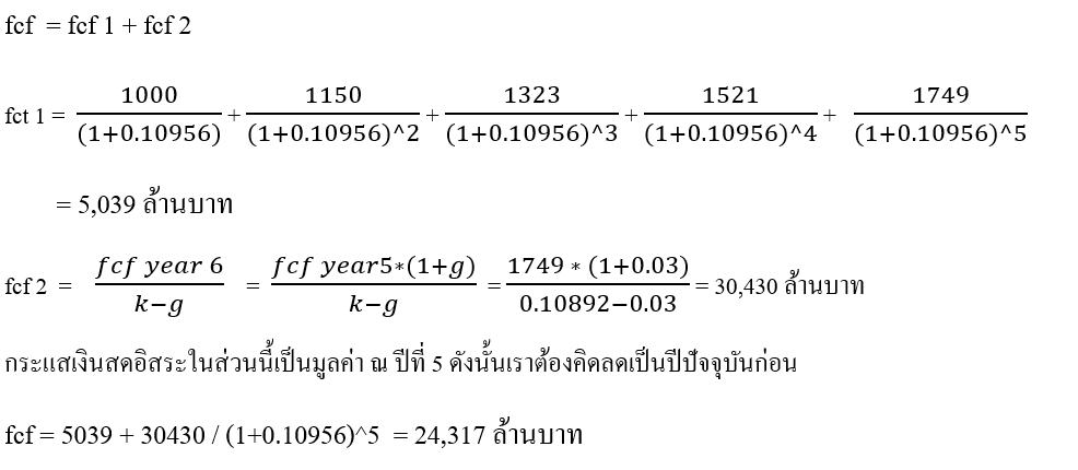 เมื่อได้การเติบโตแล้วเราจะใช้ตัวเลขการเติบโตนี้สำหรับประมาณกระแสเงินสดอิสระในอนาคตว่าจะเป็นเท่าไหร่ เช่น กระแสเงินสดอิสระในปัจจุบันของบริษัทอยู่ที่ 1,000 ล้านบาท และคาดว่าจะเติบโตปีละ 15% ต่อไปอีก 5 ปี เราจะได้ตัวเลขประมาณการกระแสเงินสดอิสระดังนี้