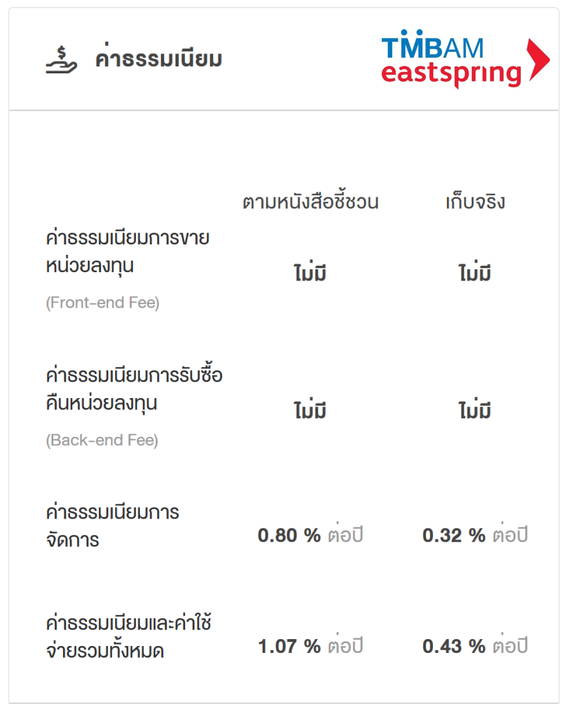 บางคนอาจเห็นว่า “โหยยย ค่าธรรมเนียมเยอะมากมาย” แต่ช้าก่อนอย่าเพิ่งรีบตกใจไป เพราะบางกองทุนอย่างเช่น TMBUSB ไม่มีการเรียกเก็บค่าธรรมเทียบทั้งตอนซื้อและขาย โดยถ้าหากสังเกตุดูรูปด้านบนนี้ จะเห็นได้ว่าค่าธรรมเนียมถูกแบ่งเป็น 2 ส่วนคือ ตามหนังสือชี้ชวน และเก็บจริง ซึ่งแตกต่างกันตรงที่ ตัวเลขค่าธรรมเนียมตามหนังสือชี้ชวนคือ ตัวเลขที่กองทุนมีสิทธิ์เรียกเก็บค่าธรรมเนียมจากเราได้ ส่วน”เก็บจริง”ก็ตรงตัวเลย เป็นตัวเลขที่กองทุนเรียกเก็บอยู่ ณ ปัจจุบันซึ่งสามารถปรับเพิ่ม หรือลดได้แต่จะไม่เกินตัวเลขที่แจ้งไว้ในหนังสือชี้ชวน