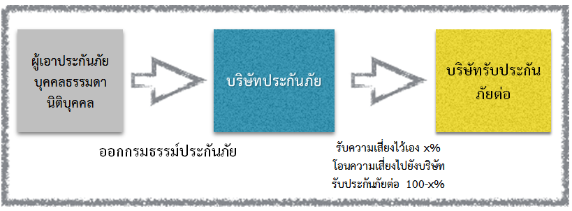 อธิบายจากในรูปนะครับ เมื่อลูกค้าตกลงทำสัญญาพร้อมกับจ่ายค่าเบี้ยให้กับบริษัทประกันภัย บริษัทประกันภัยก็ทำการออกกรมธรรม์ให้กับลูกค้าและต้องรับผิดชอบตามความเสี่ยงที่ได้ระบุไว้ในสัญญา ในกรณีที่เงินกองทุนของบริษัทประกันภัยมีไม่สูงพอหรือทรัพย์สินที่เอาประกันภัยดูแล้วมีความเสี่ยงสูง บริษัทประกันภัยสามารถขายเบี้ยประกันส่วนหนึ่งพร้อมกับโอนความเสี่ยงส่วนเกินให้กับบริษัทรับประกันภัยต่อได้ ข้อดีคือเมื่อเกิดเหตุการณ์ที่ต้องจ่ายค่าสินไหมเกิดที่ตกลงกัน (x%) บริษัทรับประกันภัยต่อจะเป็นผู้รับผิดชอบค่า