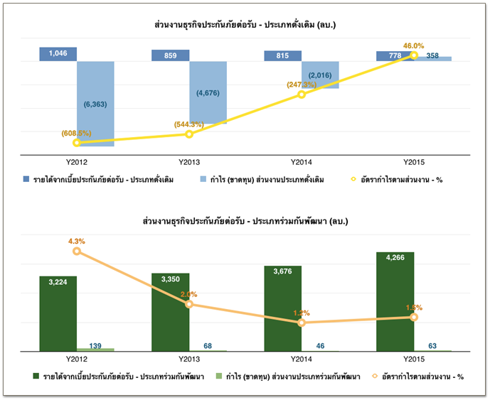 ส่วนประสิทธิภาพในการทำกำไรของธุรกิจประกัน เนื่องจากในปี 2015 ไม่มีเหตุการณ์ภัยรุนแรงอะไรมากนัก ทำให้อัตรากำไรจากธุรกิจเดิมออกมาค่อนข้างดีมาก เทียบกับสินค้าใหม่ของบริษัทที่เป็นประเภทร่วมกันพัฒนาที่ผลตอบแทนยังไม่ดีนัก ส่วนหนึ่งมาจากกลุ่มสัญญาประกันภัยอุบัตเหตุสำหรับบุคลากรครูที่มีค่าสินไหมสูงกว่าที่คาดไว้ ปัจจุบันได้ทำการลดสัดส่วนกลุ่มนี้ลงแล้ว และเนื่องจากเป็นสินค้าใหม่ที่เริ่มทำตลาดและยังมีขนาดที่ใหญ่ไม่มากพอ ผู้บริหารเชื่อว่าพอขยายฐานเบี้ยให้มากถึงระดับหนึ่งความผันผวนจะลดลงและผลตอบแทนจะอยู่ในระดับที่คาดการณ์ไว้