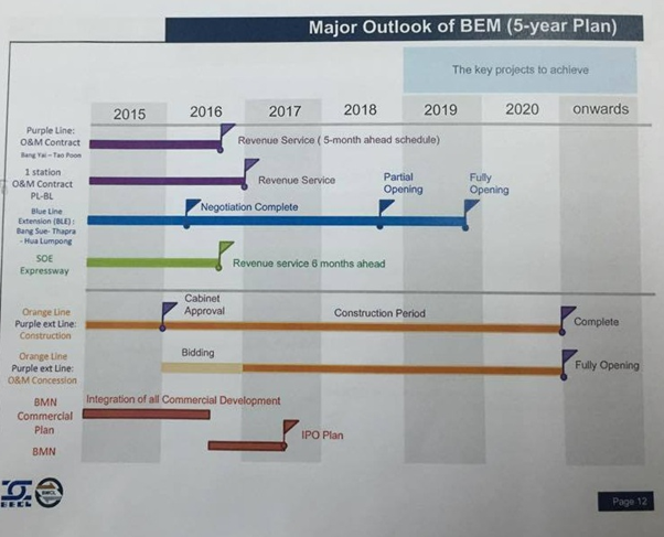 สำหรับแผนการเติบโตของธุรกิจรถไฟฟ้าน่าจะเริ่มเห็นผลที่ดีขึ้นจากการเปิดรถไฟฟ้าสายสีม่วง (ช่วงบางใหญ่-เตาปูน) ในช่วงสิงหาคมปี 2016 ที่จะถึงนี้ ซึ่งน่าจะสร้างผลกำไรให้ทันทีเนื่องจากเป็นสัมปทานประเภท PPP Gross Cost (รัฐเป็นผู้ลงเงินก่อสร้างรวมถึงรับความเสี่ยงค่าโดยสารและจ้างเอกชนเป็นผู้เดินรถและซ่อมบำรุง โดยรัฐจ่ายค่าจ้างเดินรถ) หลังจากนั้นจะมีการเชื่อมต่อสถานีเตาปูนจากสายสีม่วงเพื่อเชื่อมกับสถานีบางซื่อของสายสีน้ำเงินในปัจจุบันซึ่งก็น่าจะเป็นการเพิ่ม Ridership หรือเพิ่มจำนวนผู้โดยสารในสายสีน้ำเงินที่ดำเนินการอยู่ในปัจจุบันให้เพิ่มมากขึ้นได้