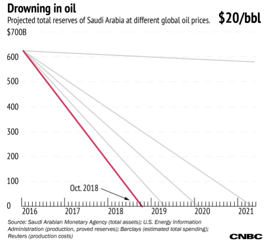 ประมาณการว่าถ้าน้ำมันอยู่ในระดับ $20 ต่อบาร์เรล ทุนสำรองฯของซาอุดิอาระเบียจะหมดภายในปี 2018