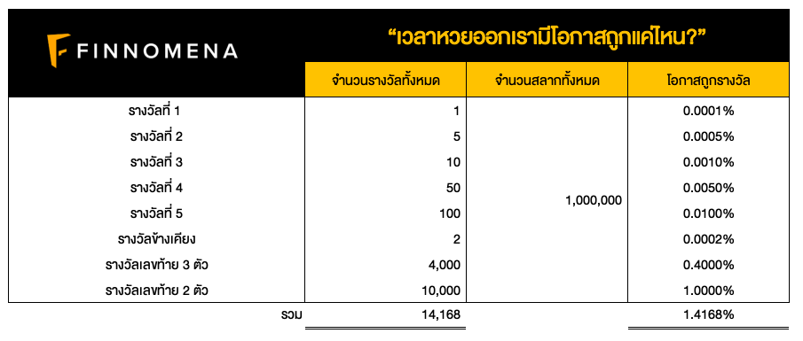 จากการคำนวณเชิงสถิติ โอกาสที่เราจะถูกหวยสักรางวัลมีเพียง 1.4% โอกาสที่เราจะไม่ถูกหวยเลยคือ 98.6% โอกาสที่เราจะถูกรางวัลที่ 1 มีแค่ 0.0001%