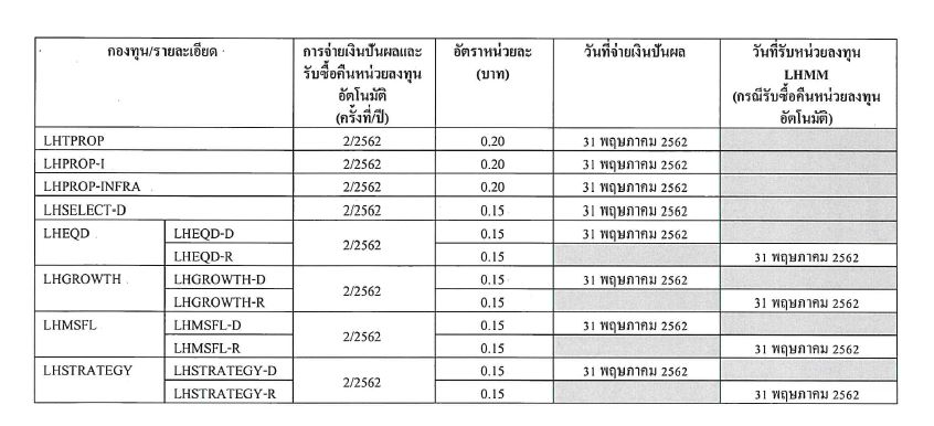 บริษัทหลักทรัพย์จัดการกองทุน แลนด์ แอนด์ เฮ้าส์ จำกัด (“บริษัทจัดการ”) ในฐานะบริษัทจัดการกองทุนของกองทุนดังกล่าว ขอแจ้งการจ่ายเงินปันผลและการรับซื้อคืนหน่วยลงทุนอัตโนมัติของกองทุน งวดผลการดำเนินงานตั้งแต่วันที่ 1 มีนาคม 2562 ถึงวันที่ 30 เมษายน 2562