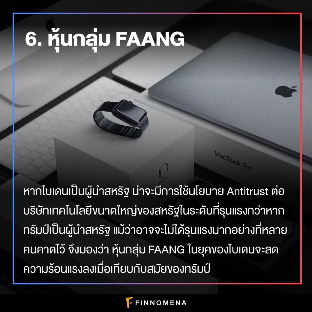 หก หุ้นกลุ่ม FAANG หากไบเดนเป็นผู้นำสหรัฐ น่าจะมีการใช้นโยบาย Antitrust ต่อบริษัทเทคโนโลยีขนาดใหญ่ของสหรัฐในระดับที่รุนแรงกว่าหากทรัมป์เป็นผู้นำสหรัฐ แม้ว่าอาจจะไม่ได้รุนแรงมากอย่างที่หลายคนคาดไว้ จึงมองว่า หุ้นกลุ่ม FAANG ในยุคของไบเดนจะลดความร้อนแรงลงเมื่อเทียบกับสมัยของทรัมป์