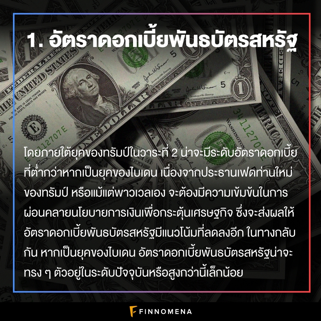 หนึ่ง อัตราดอกเบี้ยพันธบัตรสหรัฐ โดยภายใต้ยุคของทรัมป์ในวาระที่ 2 น่าจะมีระดับอัตราดอกเบี้ยที่ต่ำกว่าหากเป็นยุคของไบเดน เนื่องจากประธานเฟดท่านใหม่ของทรัมป์ หรือแม้แต่พาวเวลเอง จะต้องมีความเข้มข้นในการผ่อนคลายนโยบายการเงินเพื่อกระตุ้นเศรษฐกิจ ซึ่งจะส่งผลให้อัตราดอกเบี้ยพันธบัตรสหรัฐมีแนวโน้มที่ลดลงอีก ในทางกลับกัน หากเป็นยุคของไบเดน อัตราดอกเบี้ยพันธบัตรสหรัฐน่าจะทรง ๆ ตัวอยู่ในระดับปัจจุบันหรือสูงกว่านี้เล็กน้อย