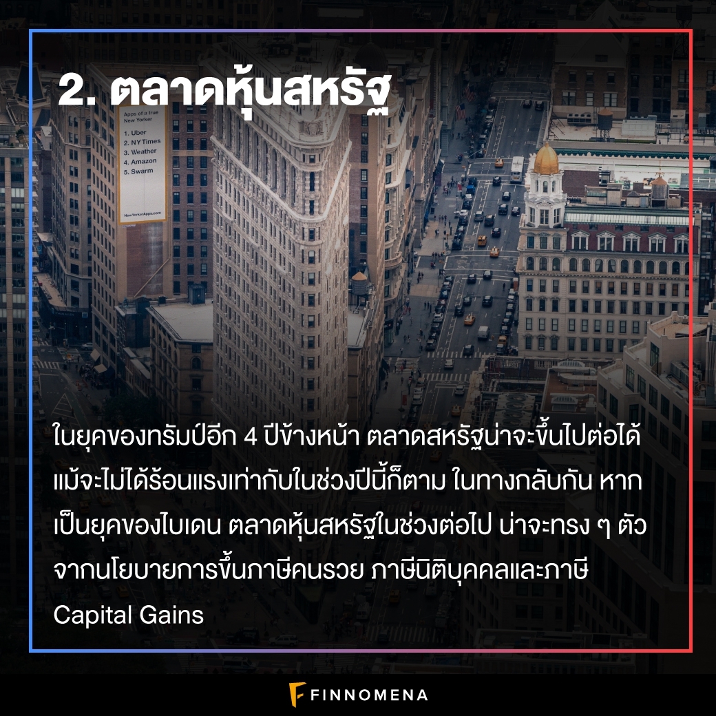 สอง ตลาดหุ้นสหรัฐ ในยุคของทรัมป์อีก 4 ปีข้างหน้า ตลาดสหรัฐน่าจะขึ้นไปต่อได้แม้จะไม่ได้ร้อนแรงเท่ากับในช่วงปีนี้ก็ตาม ในทางกลับกัน หากเป็นยุคของไบเดน ตลาดหุ้นสหรัฐในช่วงต่อไป น่าจะทรง ๆ ตัว จากนโยบายการขึ้นภาษีคนรวย ภาษีนิติบุคคลและภาษี Capital Gains