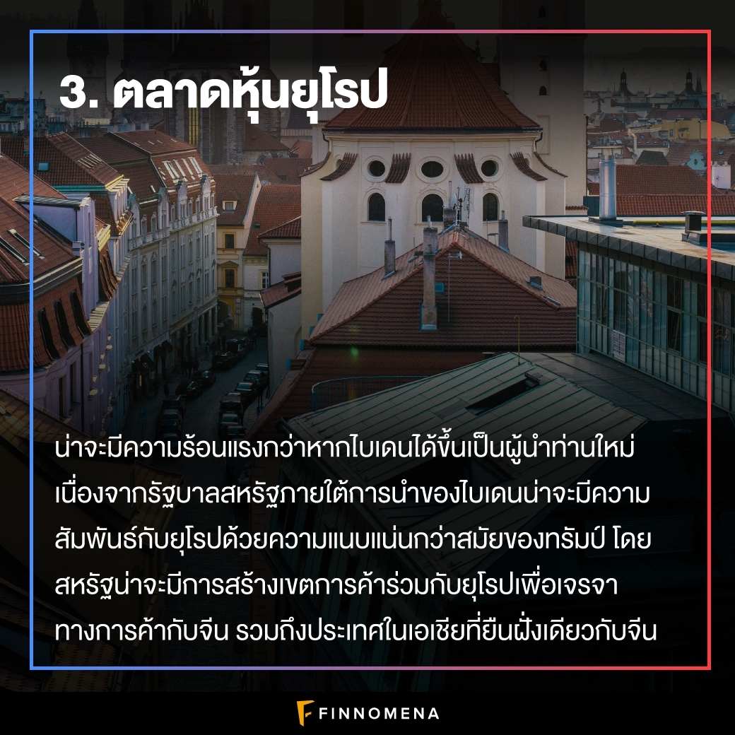 สาม ตลาดหุ้นยุโรป น่าจะมีความร้อนแรงกว่าหากไบเดนได้ขึ้นเป็นผู้นำท่านใหม่ เนื่องจากรัฐบาลสหรัฐภายใต้การนำของไบเดนน่าจะมีความสัมพันธ์กับยุโรปด้วยความแนบแน่นกว่าสมัยของทรัมป์ โดยสหรัฐน่าจะมีการสร้างเขตการค้าร่วมกับยุโรปเพื่อเจรจาทางการค้ากับจีน รวมถึงประเทศในเอเชียที่ยืนฝั่งเดียวกับจีน