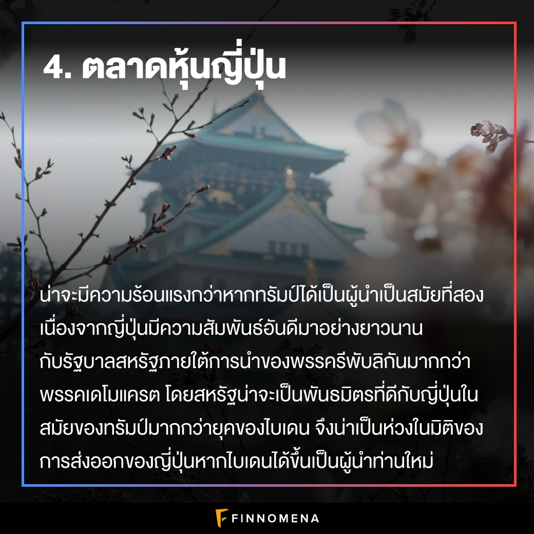 สี่ ตลาดหุ้นญี่ปุ่น น่าจะมีความร้อนแรงกว่าหากทรัมป์ได้เป็นผู้นำเป็นสมัยที่สอง เนื่องจากญี่ปุ่นมีความสัมพันธ์อันดีมาอย่างยาวนาน กับรัฐบาลสหรัฐภายใต้การนำของพรรครีพับลิกันมากกว่าพรรคเดโมแครต โดยสหรัฐน่าจะเป็นพันธมิตรที่ดีกับญี่ปุ่นในสมัยของทรัมป์มากกว่ายุคของไบเดน จึงน่าเป็นห่วงในมิติของการส่งออกของญี่ปุ่นหากไบเดนได้ขึ้นเป็นผู้นำท่านใหม่