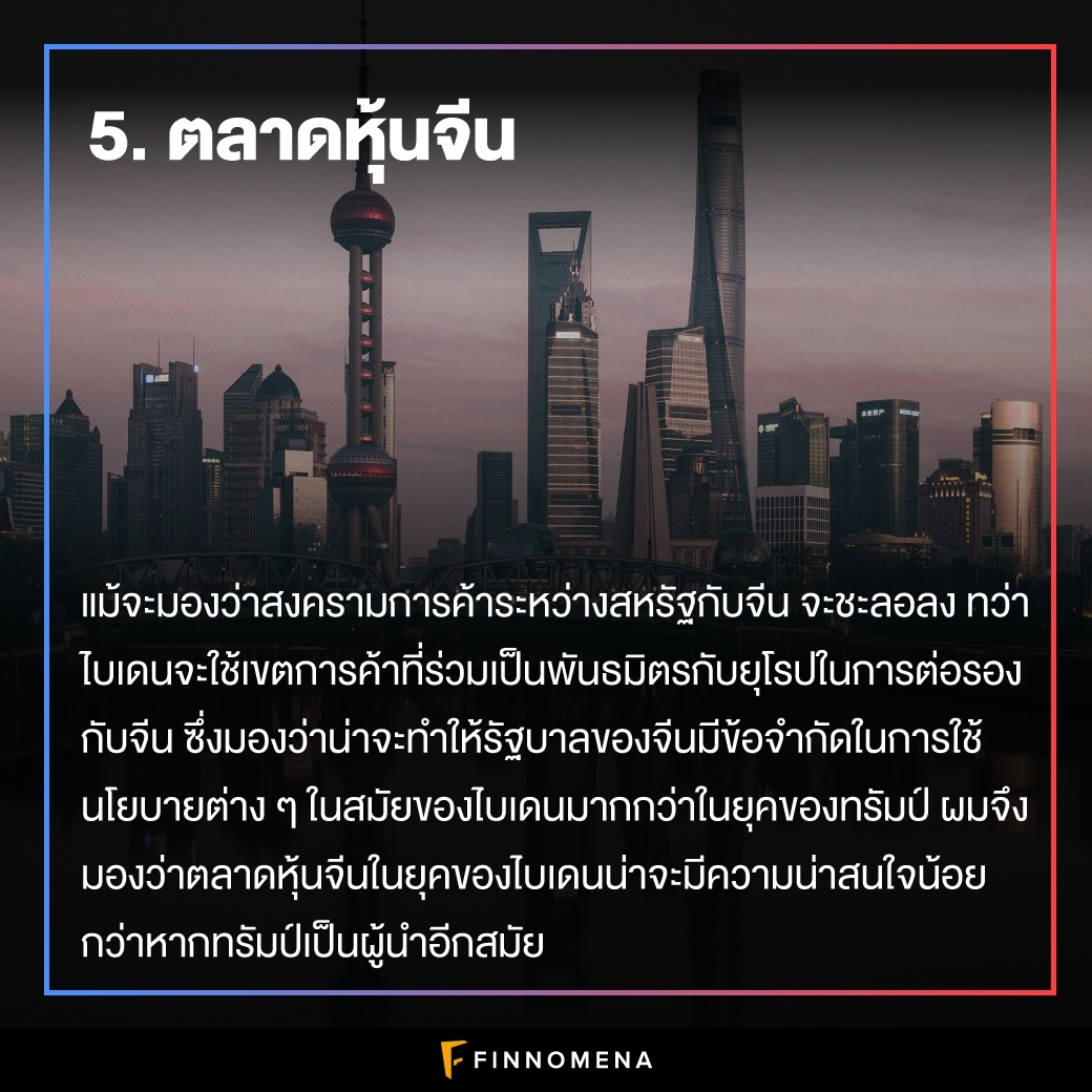 ห้า ตลาดหุ้นจีน แม้จะมองว่าสงครามการค้าระหว่างสหรัฐกับจีน จะชะลอลง ทว่าไบเดนจะใช้เขตการค้าที่ร่วมเป็นพันธมิตรกับยุโรปในการต่อรองกับจีน ซึ่งมองว่าน่าจะทำให้รัฐบาลของจีนมีข้อจำกัดในการใช้นโยบายต่าง ๆ ในสมัยของไบเดนมากกว่าในยุคของทรัมป์ ผมจึงมองว่าตลาดหุ้นจีนในยุคของไบเดนน่าจะมีความน่าสนใจน้อยกว่าหากทรัมป์เป็นผู้นำอีกสมัย