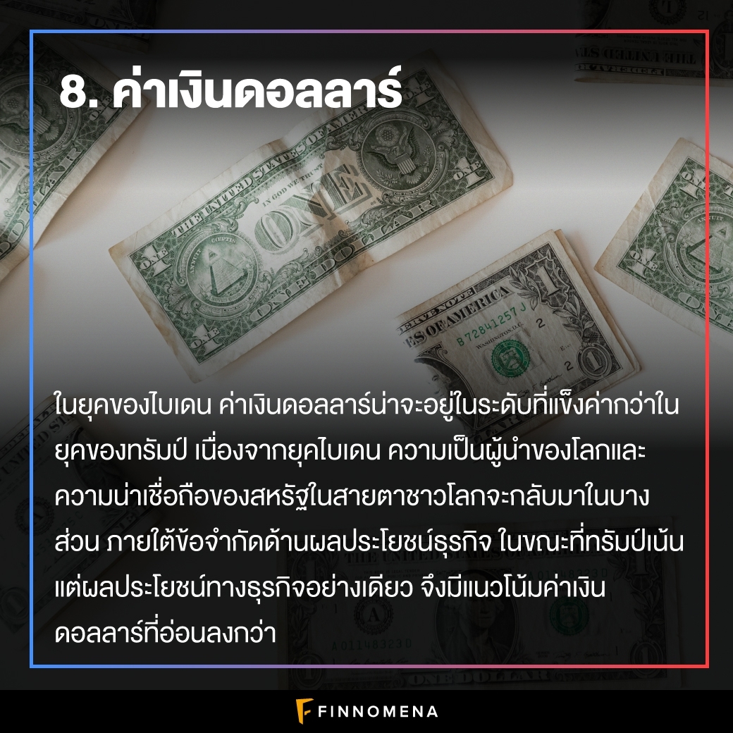 ท้ายสุด ค่าเงินดอลลาร์ ในยุคของไบเดน ค่าเงินดอลลาร์น่าจะอยู่ในระดับที่แข็งค่ากว่าในยุคของทรัมป์ เนื่องจากยุคไบเดน ความเป็นผู้นำของโลกและความน่าเชื่อถือของสหรัฐในสายตาชาวโลกจะกลับมาในบางส่วน ภายใต้ข้อจำกัดด้านผลประโยชน์ธุรกิจ ในขณะที่ทรัมป์เน้นแต่ผลประโยชน์ทางธุรกิจอย่างเดียว จึงมีแนวโน้มค่าเงินดอลลาร์ที่อ่อนลงกว่า