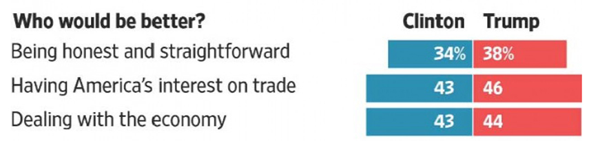 สอง ต้องยอมรับว่าในประเด็นเศรษฐกิจนั้น ทรัมป์ดูจะไม่เป็นรองคลินตัน แถมยังเบียดได้เหนือกว่านิดๆ สังเกตได้จากการโต้วาทีทั้งสามครั้ง แม้ในภาพรวมทรัมป์ดูจะเป็นรอง ทว่าหากพิจารณาเฉพาะประเด็นเศรษฐกิจแล้ว ทรัมป์ยังดูดีกว่าคลินตันเล็กน้อย ดังรูป