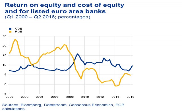 โดยอัตราผลตอบแทนต่อเงินกองทุนเฉลี่ยของแบงก์ในยุโรปเท่ากับร้อยละ 5.8 ในปี 2015 ซึ่งถือว่ายังอยู่ในระดับที่ต่ำกว่าต้นทุนของเงินกองทุน ซึ่งอยู่ที่ร้อยละ 9 ทั้งนี้ แนวโน้มดังกล่าวได้เป็นไปในลักษณะนี้อย่างต่อเนื่องนับตั้งแต่ปี 2008 ดังรูปที่ 1 โดยปรากฏการณ์ที่ผลกำไรอยู่ในระดับต่ำกว่าต้นทุนก็ยังไม่มีแนวโน้มว่าจะเปลี่ยนไปจากนี้ในเร็ววัน จะเห็นได้จากอัตราส่วน Price to Book ของแบงก์ในยุโรปที่ต่ำกว่าแบงก์ในภูมิภาคอื่นๆ อีกทั้งยังลดลงเร็วกว่าแบงก์ในภูมิภาคอื่นๆ อีกต่างหาก