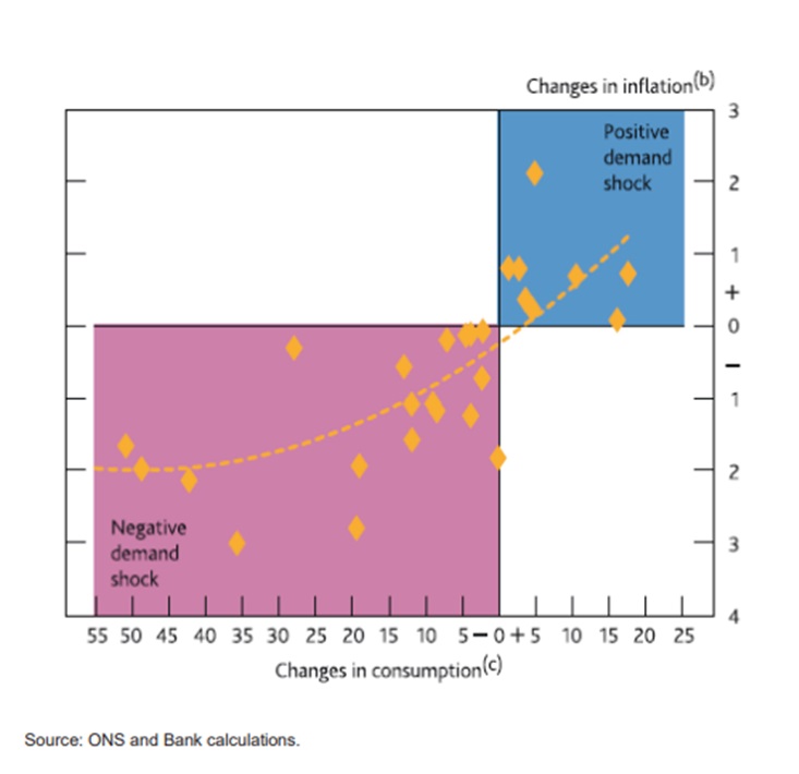 หนึ่ง จากการเก็บข้อมูลเงินเฟ้อในหมวดสินค้าต่าง ๆ ของอังกฤษในปี 2020 จากรูป จะพบว่ามีสินค้าอยู่ประมาณหนึ่งในสามของกลุ่มอุตสาหกรรมทั้งหมดที่มีอัตราการเปลี่ยนแปลงของราคาและปริมาณการบริโภคเป็นบวก นั่นคือ มีพลังของอุปสงค์ที่เป็นบวกอยู่ในกลุ่มสินค้าเหล่านั้น ซึ่งหมายถึงว่าภายใต้อัตราเงินเฟ้อในปี 2020 ที่ต่ำนั้น ก็ยังมีกลุ่มสินค้าที่มีระดับราคาสูงขึ้นซ่อนอยู่หลายประเภท