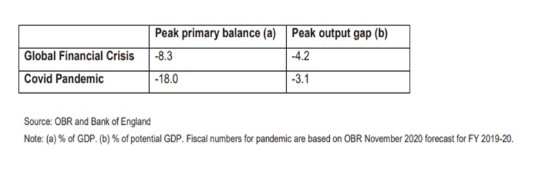 ห้า ปัจจัยด้านการคลัง บทความเมื่อสัปดาห์ที่แล้ว เราได้ดูตัวเลขของฝั่งสหรัฐ ซึ่งพบว่าเม็ดเงินกระตุ้นด้านการคลังในช่วงโควิดสูงกว่าช่วงซับไพร์มหลายเท่า สำหรับในอังกฤษก็เช่นกัน จากตารางจะพบว่าเม็ดเงินกระตุ้นด้านการคลังในรอบนี้มากกว่าเมื่อกว่า 10 ปีก่อนถึงกว่า 2 เท่า ในขณะที่ Output Gap ติดลบยังน้อยกว่าอีก