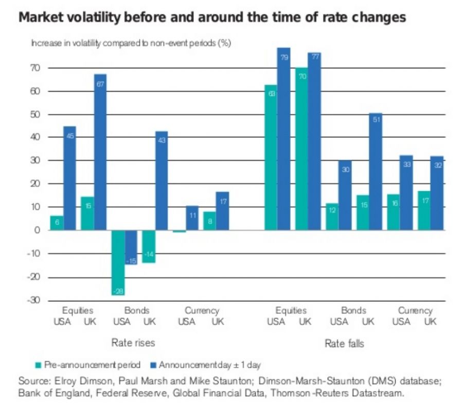 สิ่งที่น่าสังเกต คือ ระดับการแกว่งตัวของราคาสินทรัพย์ โดยที่ระดับความผันผวนของ ตราสารทุนในช่วงอัตราดอกเบี้ยขาลงสูงกว่าช่วงที่อัตราดอกเบี้ยขาขึ้นอยู่ร้อยละ 25 ในตลาดหุ้นสหรัฐ และร้อยละ 6 ในตลาดหุ้นอังกฤษ สำหรับตลาดตราสารหนี้ ระดับความผันผวนของตราสารหนี้สหรัฐในช่วงอัตราดอกเบี้ยขาลงสูงกว่าช่วงที่อัตราดอกเบี้ยขาขึ้นอยู่ร้อยละ 9 และร้อยละ 11 สำหรับในสหรัฐและอังกฤษตามลำดับ