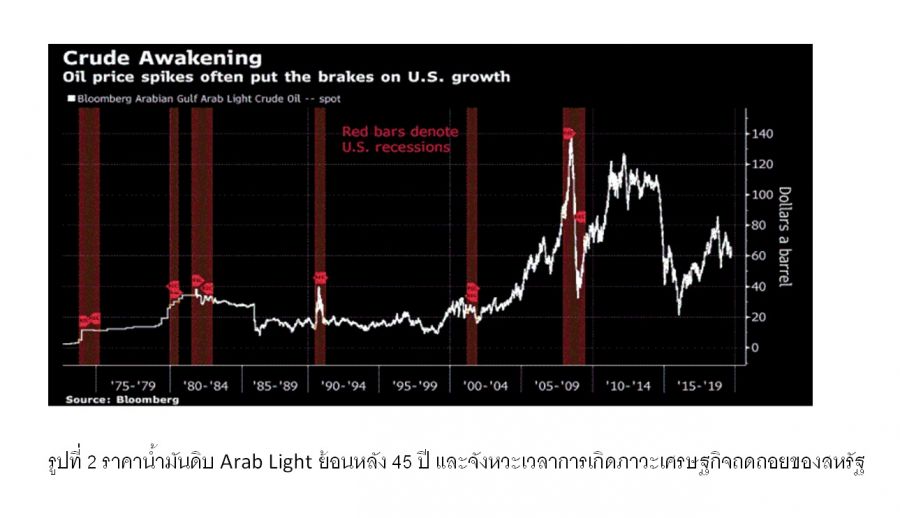 คำตอบหนึ่งคือจะเกิดการชะลอตัว หรืออาจถึงขั้นถดถอยของเศรษฐกิจของประเทศที่พึ่งพาน้ำมันดิบจากการนำเข้า ไม่ว่าจะเป็นอินเดีย ตุรกี และอาจจะรวมถึงสหรัฐที่แม้จะเป็นผู้ผลิตน้ำมันดิบรายใหญ่ที่สุดของโลก ทว่าก็ยังนำเข้าน้ำมันดิบจากโอเปคอยู่ ด้วยเหตุผลที่สหรัฐถือเป็นมหาอำนาจทางการทหาร น้ำมันดิบจึงถือเป็นสินค้าทางยุทธศาสตร์ที่ต้องมีไว้เผื่อในยามจำเป็น โดยจากรูปที่ 2 จะเห็นได้ว่าการเกิดภาวะเศรษฐกิจถดถอยของสหรัฐในอดีต 6 ครั้ง ล้วนแล้วแต่เป็นช่วงเวลาที่ราคาน้ำมันดิบเกิดการขยับขึ้นแบบกระชากแรงๆ ไม่ว่าจะเป็นการปฏิวัติของอิหร่านในปี 1984 หรือเหตุการณ์อิรักบุกคูเวตในปี 1990