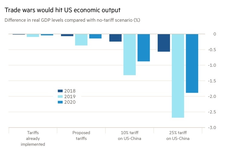 จากการวิเคราะห์ของ BEA ดังรูปที่ 1 คาดว่ากระทบราว 1.5-3% ของ GDP ทว่าหากรวมผลกระทบจากการตอบโต้จากจีนด้วย จะกระทบสูงสุดถึง 4% ดังรูปที่ 2 ซึ่งถือว่ายังเบากว่าวิกฤตซับไพรม์ที่กระทบต่อสหรัฐฯ กว่า 5% ของจีดีพี