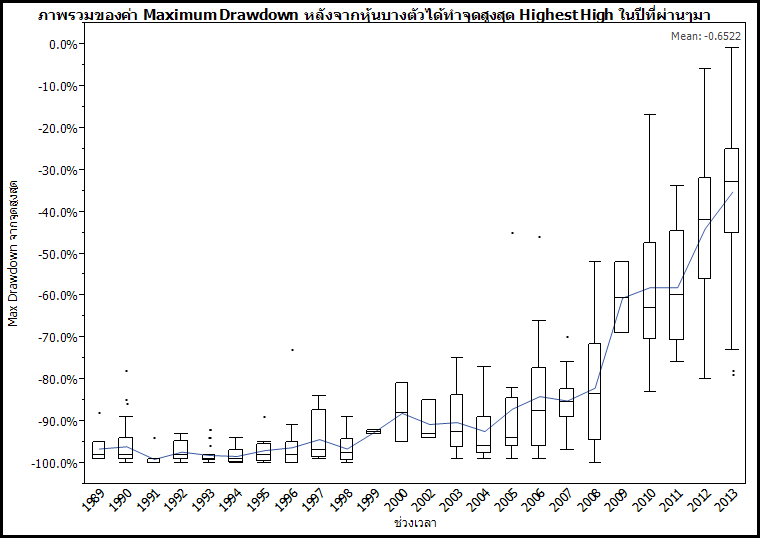 Note : จะสังเกตุได้ว่าในปี 2013 หุ้นที่พึ่งทำ Highest High มีค่า Maximum Drawdown โดยเฉลี่ยหลังจากพีคไปแล้วถึงราวๆ 35% เลยทีเดียว มันจึงไม่แปลกที่เราจะเห็นหลายๆคนที่ยังไม่ได้คัทเริ่มออกอาการคัทไม่ลงหรือเอาหัวจุ่มดินไม่อยากมองพอร์ทกันแล้ว