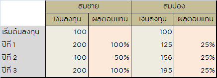 สมมติ นาย สมชาย และ นาย สมปอง มีเงินทุนตั้งต้น 100 บาท เท่ากัน นายสมชาย ทำกำไรปีแรกได้ 100% ปีที่สองขาดทุนไป 50% ส่วนปีที่ 3 เขากลับมา โดยทำได้ 100% อีกรอบ เทียบกับ นายสมปอง ที่ลงทุนแบบมีระบบ ไม่เสี่ยงเกินตัวไปเรื่อยๆปีละ 25% 3 ปีติดต่อกัน