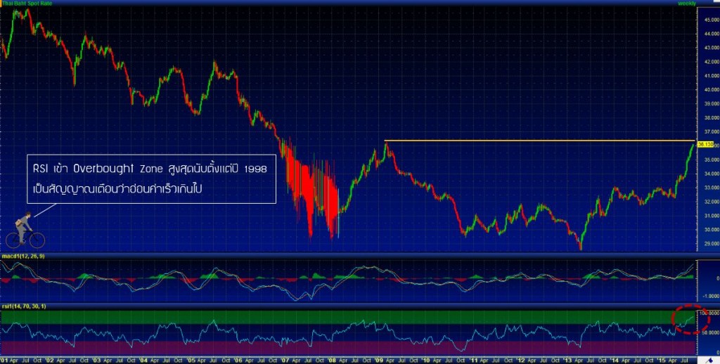 4. ถ้าดูมุมมองทางเทคนิคในกราฟรายสัปดาห์ระยะยาวหน่อย จะเห็นว่า THB/USD เคยทำจุดสูงสุดเมื่อต้นปี 2009 ที่ 36.31 THB/USD จุดนี้จึงน่าสนใจ เนื่องจาก เมื่อพิจารณาประกอบกับ RSI จะพบว่า RSI ขึ้นมาที่ Overbought Zone ระดับ 85.9 สูงสุดนับตั้งแต่วิกฤตต้มยำกุ้งปี 1998 ทีเดียว ดังนั้น มีโอกาสที่ค่าเงินบาทจะกลับทิศได้ทุกเมื่อครับ ซึ่งผมเองก็จินตนาการไม่ออกว่ามันจะกลับทิศได้อย่างไร