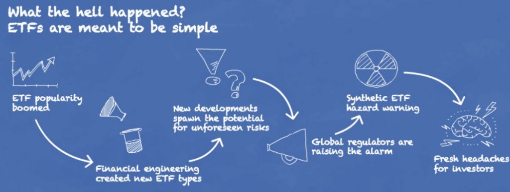 พอ ETF โตเรื่อยๆ เหล่านักการเงินระดับเทพ ก็จะคิดผลิคภัณฑ์ที่เข้าใจยากขึ้นเรื่อยๆเพื่อตอบสนอง Demand ของตลาด ซึ่งผลิคภัณฑ์ทางการเงินใหม่ๆนั้น แน่นอนว่า กลต. ตรวจสอบไม่ได้หมด 100% หรอกว่าความเสี่ยงมันมีอะไรบ้าง ดังนั้นกฎและข้อบังคับ จึงล่าหลังผลิตภัณฑ์ที่ออกไปแล้วอยู่เสมอๆ แต่พอมารู้ทีหลัง แล้วออกมาเตือน ก็มักจะสายเกินไป เพราะเหยื่อในเครื่องมือวิศวะทางการเงินนั้นคิดกับดักกันไปหมดแล้ว
