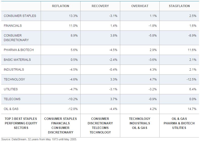 ในช่วง Recovery Stage นั้นหุ้นในกลุ่มอุตสาหกรรมที่น่าสนใจลงทุน 3 อันดับแรกคือ 1) Consumer Discretionary (สินค้าฟุ่มเฟือยและกลุ่มบันเทิง) 2) Telecoms (สื่อสาร) 3) Technology (ไอที) แต่ทั้งนี้ มันก็เป็นแค่การศึกษาในเมืองนอกนะครับ
