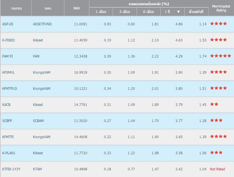 ผมพาไปดูผลตอบแทนย้อนหลังของกองทุนประเภทนี้กันนะครับ นี่คือ 10 กองทุนตราสารหนี้ที่ผลตอบแทนดีสุดในตลาด (ข้อมูลจาก www.wealthmagik.com)