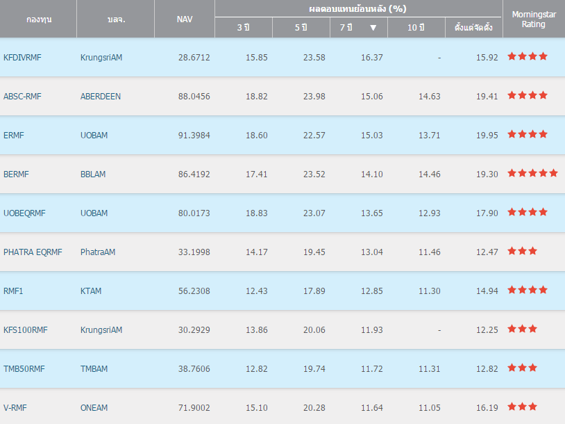 ส่วนใครสนใจหากองทุน RMF ลงทุน แล้วทำเป็นลืมแบบเฮียแกบ้างละก็ นี่คือตารางกองทุน RMF ที่ผลตอบแทนย้อนหลังดีที่สุดใน 7 ปีที่ผ่านมาครับ เลือกเลยตามใจชอบ