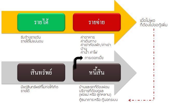 จะเห็นว่า คนจน ชนชั้นแรงงานนั้น รายได้หลัก มาจากค่าจ้างรายวัน ซึ่งเมื่อเจอรายจ่ายเข้าไป ก็ไม่พอ พอไม่พอ ก็ต้องไปกู้ ทั้งในระบบ และนอกระบบ เพิ่มภาระดอกเบี้ยอีกทาง ส่วนสินทรัพย์ที่เขาเหล่านั้นสะสม ก็เป็นสินทรัพย์ที่ไม่ก่อให้เกิดรายได้ทั้งสิ้น เมื่อวงจรนี้ยังทำงานของมันไปเรื่อยๆ Wealth หรือความมั่งคั่ง ก็จะค่อยๆลงเรื่อยๆ