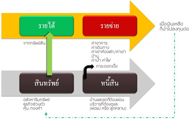 ความแตกต่างนั้นชัดเจนครับ คนเหล่านี้ ไม่ต้องพึ่งพาเงินจากแรงงาน แต่ได้รายได้จากสินทรัพย์เพื่อการลงทุน ซึ่งครอบคลุมรายจ่ายทั้งหมด แถมเมื่อมีเงินเหลือ ก็นำมาลงทุนต่อ (Reinvest) เรื่อยๆ ไม่ต้องเป็นทุกข์กับนายจ้างที่ไม่ยุติธรรม ไม่ต้องนั่งทำงานที่ตัวเองไม่ได้รัก ไม่ต้องตื่นเช้าไปต่อสู้กับรถติดวันละ 2-3 ชม. … ดูมีความสุขและน่าอิจฉาใช่ไหมครับ?
