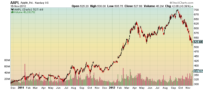 ในวันที่ Steve Jobs จากไป ราคาหุ้นของ Apple แทบไม่ได้รับผลกระทบ (อาจเพราะราคาลงมาแล้วก่อนหน้านั้นเล็กน้อย) ทั้งๆที่นักวิเคราะห์ในตลาดก็มองกันว่า การขาด Steve jobs จะทำให้ Apple ขาด Innovation ขาดนวัตกรรมใหม่ๆในการสร้างสรรค์ผลงาน ซึ่งหากมองตามปัจจัยพื้นฐานในระยะยาวแล้ว นี้คือข่าวร้ายที่น่าเป็นห่วงเลยนะ แต่หนึ่งปีให้หลังจากที่ Jobs จากโลกนี้ไป ราคาหุ้น Apple ขึ้นจากวันนั้นขึ้นมาร่วม 100% พร้อมยอดขายที่สูงสุดเป็นประวัติการณ์ (ข่าวดี) แต่แล้ว การเปิดตัว iPhone5 ที่ตลาดฮือฮาอยู่ซักระยะก็ไม่ได้ทำให้ราคาหุ้นวิ่งต่อเนื่องแต่อย่างใด แต่ราคา AAPL กลับไหลลงมาจนวันสุกร์ที่ผ่านมาอยู่ที่ $527 นั้นเป็นตลาดเริ่มกังวลแล้วว่า นวัตกรรม ที่ขาดไป (สังเกตได้จาก iPhone5 มีแค่ เร็วขึ้น เบาขึ้น) อาจทำให้ Apple เจอกับช่วงเวลาที่ท้าทายมากขึ้น ในขณะที่ Samsung ก็ตามาติดๆ