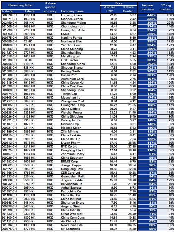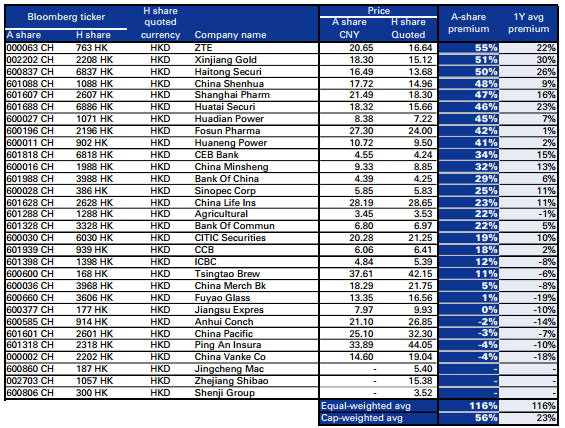โดยเฉพาะ H Share ครับ ดูตารางหุ้นตัวเดียวที่เทรดทั้งใน A และ H นะครับ