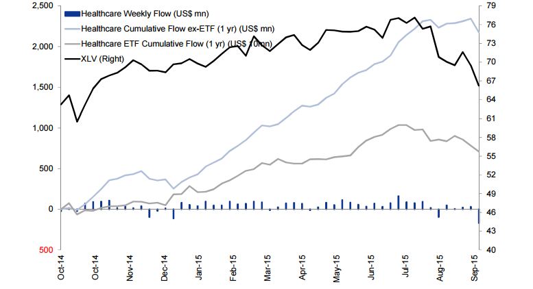 รูปข้างบน เห็นเส้นสีเทาไหมครับ? นั้นคือยอดเงินลงทุนในกองทุน ETF กลุ่ม Healthcare จะพบว่า มีแรงขายมาตั้งแต่เดือน ก.ค. แล้ว แต่ถ้าเปรียบเทียบ Fund Flow ทั้งกลุ่มจะพบว่า เงินลงทุนใน Healthcare Sector ลดลงเพียงเล็กน้อย นั้นหมายความว่า เหล่า Active Fund ยังมีเงินเข้าไป แสดงให้เห็นว่า มีนักลงทุนที่เชื่อมั่นในอุตสาหกรรมนี้อยู่ไม่น้อยครับ ส่วน Flow จาก ETF ผมเชื่อว่า เป็นการขายลดพอร์ตตามการ Re-balancing หลังตลาดหุ้นโลกปรับฐาน มากกว่าจะเกิดจากการขายเพราะจะเลิกเล่นกลุ่มนี้แล้วครับ แต่เพราะโลกในเมืองนอก เป็น ETF World กันไปแล้ว ดังนั้น Fund Flow ของ ETF จึงมีผลต่อการกำหนดทิศทางราคาหุ้นในระยะสั้นพอสมควร ความผันผวนของตลาดจึงสูงขึ้นโดยปริยาย